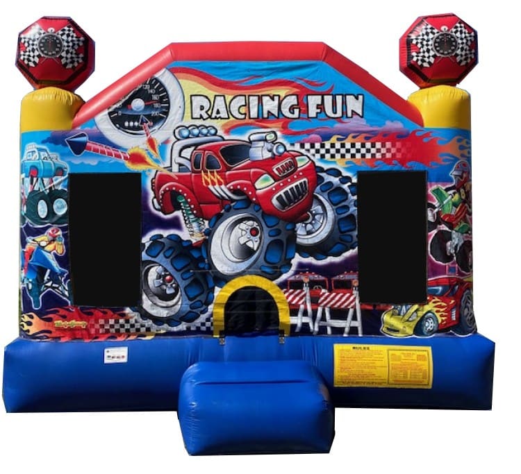 What boy you know that doesn't like Racing cars. On this Moonbounce you will not only find racing cars, but you will also find dirt bikes, 4 wheelers and monster trucks. This bounce house is a young man dream! So, if you're interested in a racing car moonbounce, this one is for you.