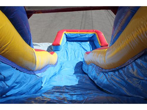 This towering moonbounce waterslide is tons of fun. It stands 18ft tall with a steep double dip slide that provides hours of fun. It has a small landing pool which provides a splash after sliding down the slide. The waterslide has stairs to the left of the slide which always climbing up to the top. This waterslide bounce house is great for all ages, yes that's right adults can enjoy as well. When the weather is hot these go fast. We have a small version of this