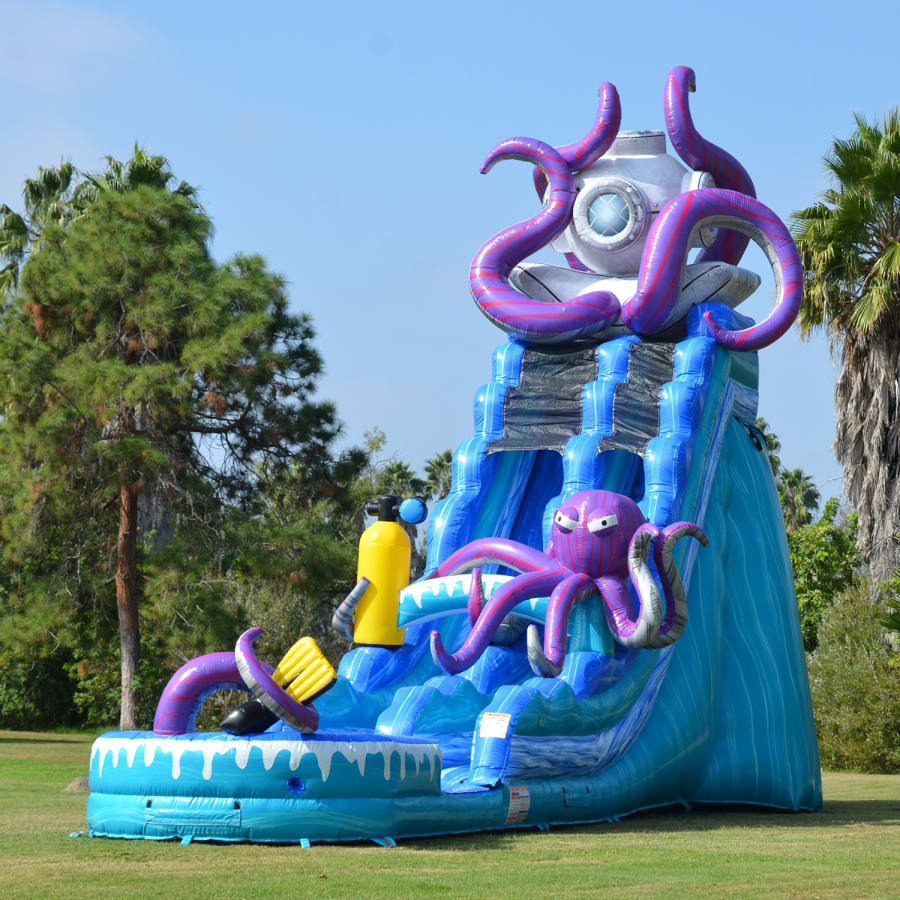 Everyone's' bucket list is to go diving with a gigantic Octopus. Well knock that off your bucket list. Dive in the Deep Sea with this 19Ft wet/dry slide. Its a perfect summer slide! Riders must navigate through a tangle of tentacles to make it to the top. Bring this slide along for your next aquatic-themed party or event!